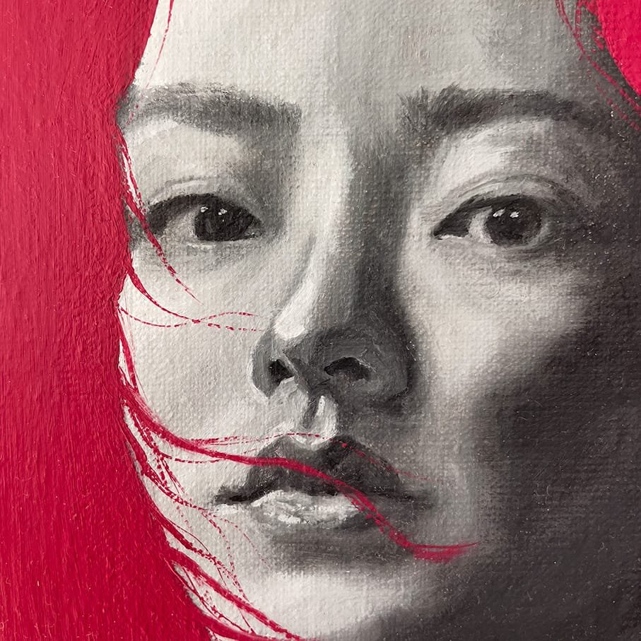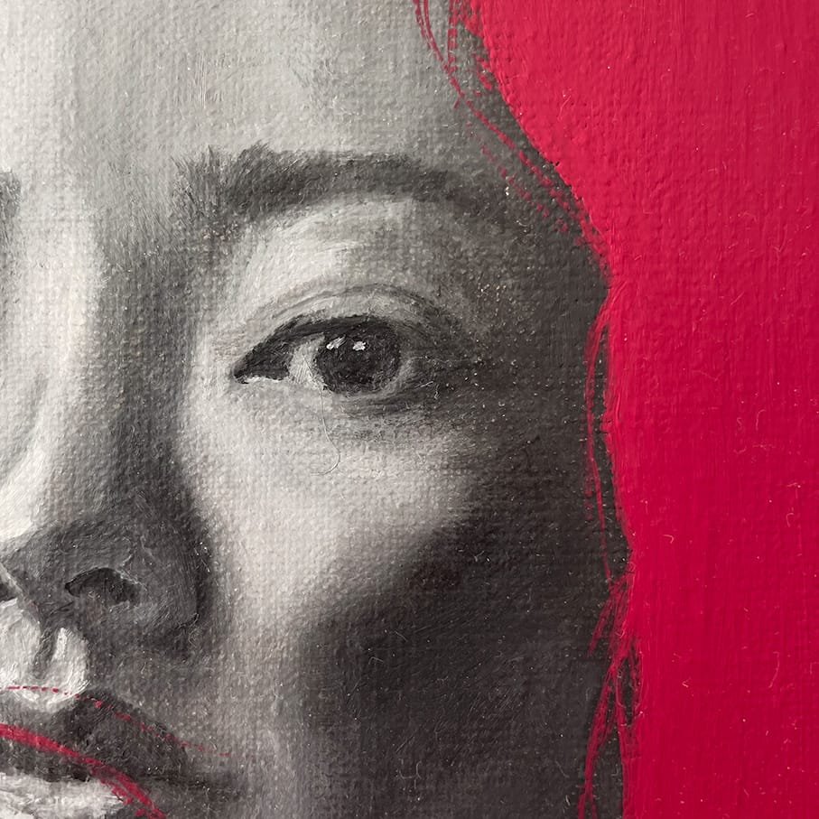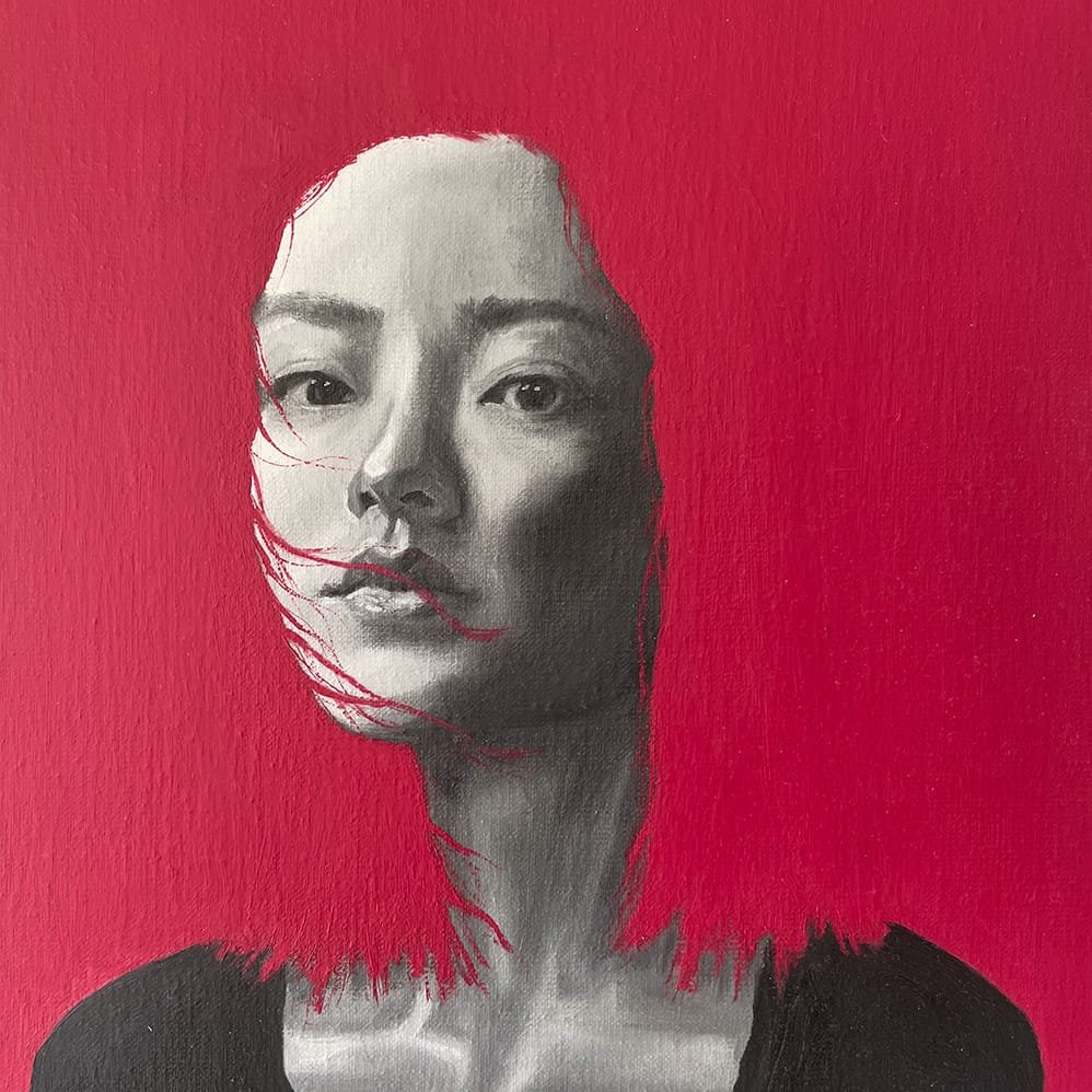 Et anderledes portræt af en kvinde, hvor motiv og baggrund næsten smelter sammen i en leg mellem farver, kontraster og former. Ansigtet er malet i sort-hvide nuancer, hvilket skaber en tydelig kontrast til den intense røde baggrund. De to elementer mødes og brydes på samme tid, så grænsen mellem figur og baggrund bliver flydende.